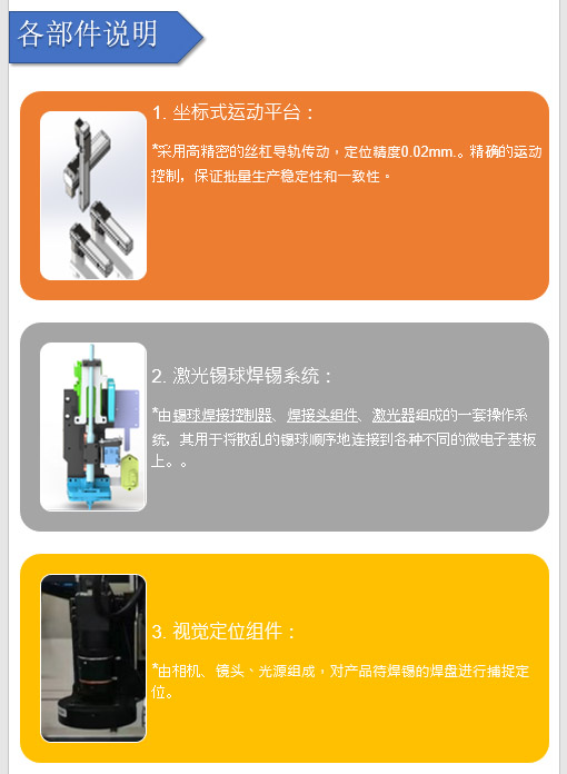 由锡球焊接控制器、焊接头组件、激光器组成的一套操作系统,其用于将散乱的锡球顺序地连接到各种不同的微电子基板上。该系统能够对直径在300mm到2000mm之间的锡球进行回流焊,其广泛应用于VCM、汽车传感器、锂电池等高科技行业。