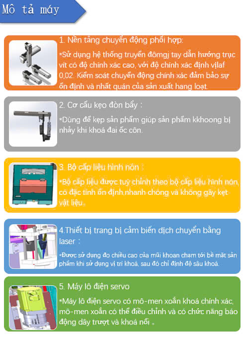 * Toàn bộ chức năng của máy bao gồm hệ thống cấp vít + hệ thống định vị tọa độ + hệ thống khóa vít chuyên nghiệp + hệ thống phát hiện thông minh. Các tính năng của nó như sau: